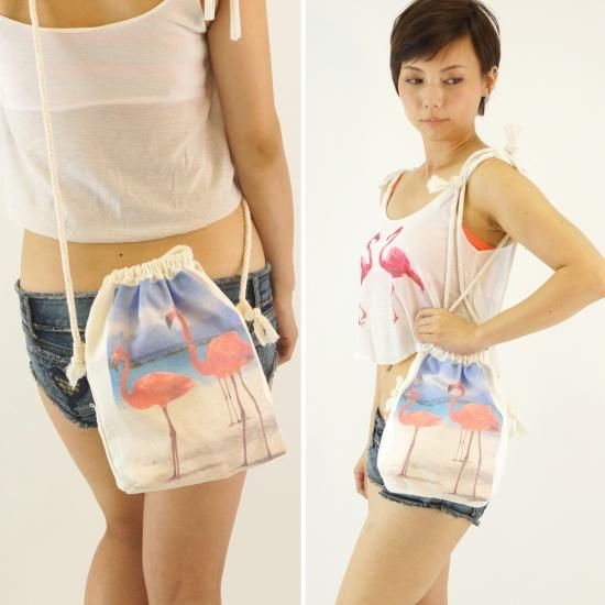 バック ポーチ 2WAY♪フラミンゴプリントのキャンバスミニショルダーバッグ☆サブバッグにも◎リラックス