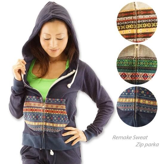 リメイク風ポケット付/スウェットジップパーカー/3カラー/エスニック/ヒッピー/カントリー/チロリアン/