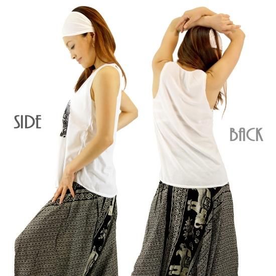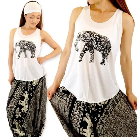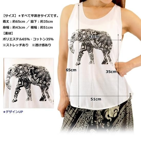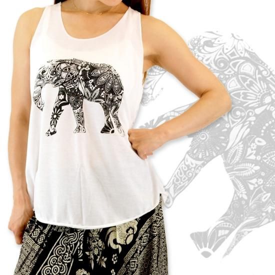 エレファント ゾウさん柄 ゆるタンクトップ エスニック アジアン トップス ゆったり ホワイト アニマル ガネーシャ